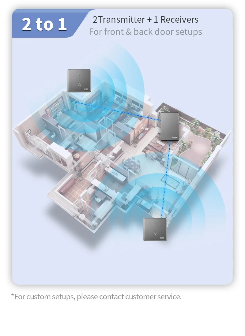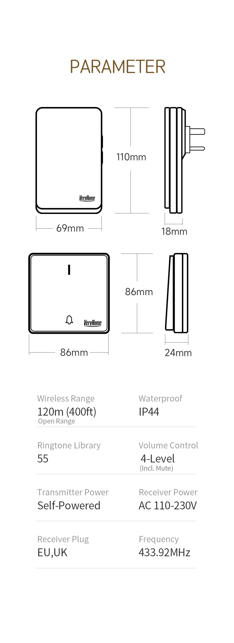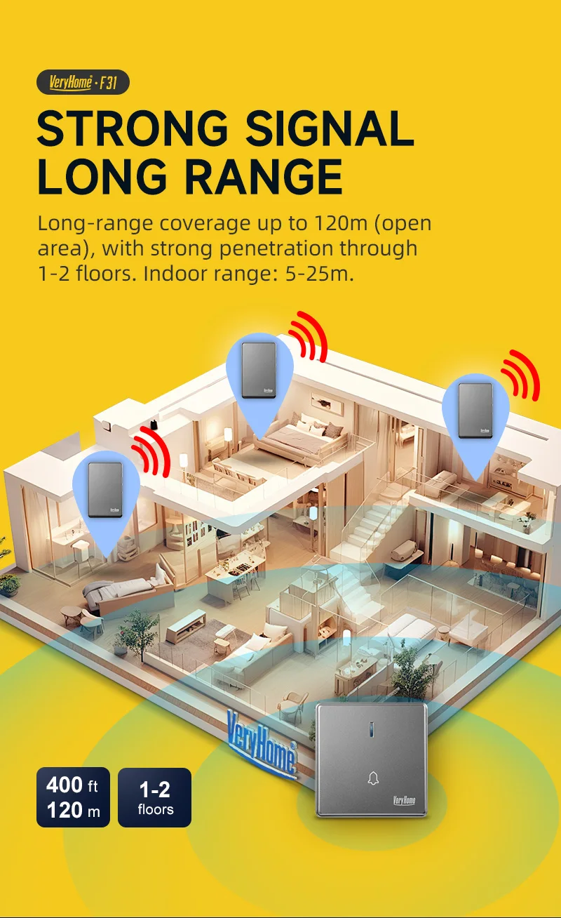 SPECIFICATIONSBrand Name: VeryHomeButton Working Temperature: -28℃ to 65℃Certification: CE,FCC,RoHSChoice: yesDoorbell Type: WireLessHigh-concerned chemical: NoneModel Number: F31Music Switch: 51 ringtonesOrigin: Mainland China...