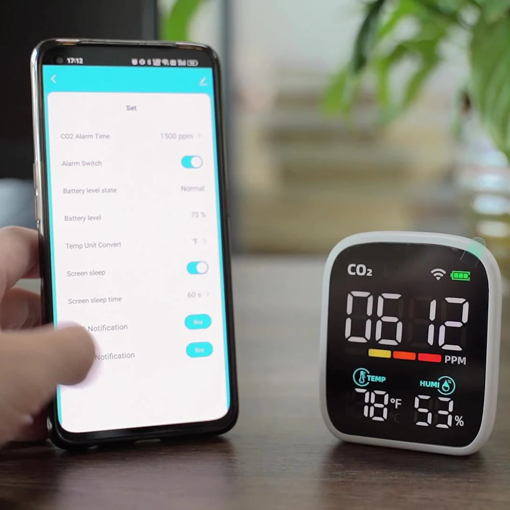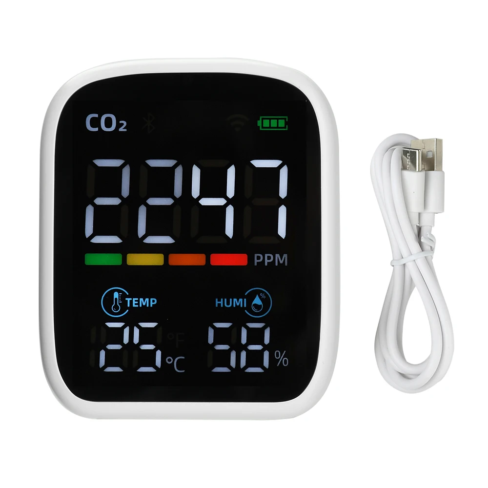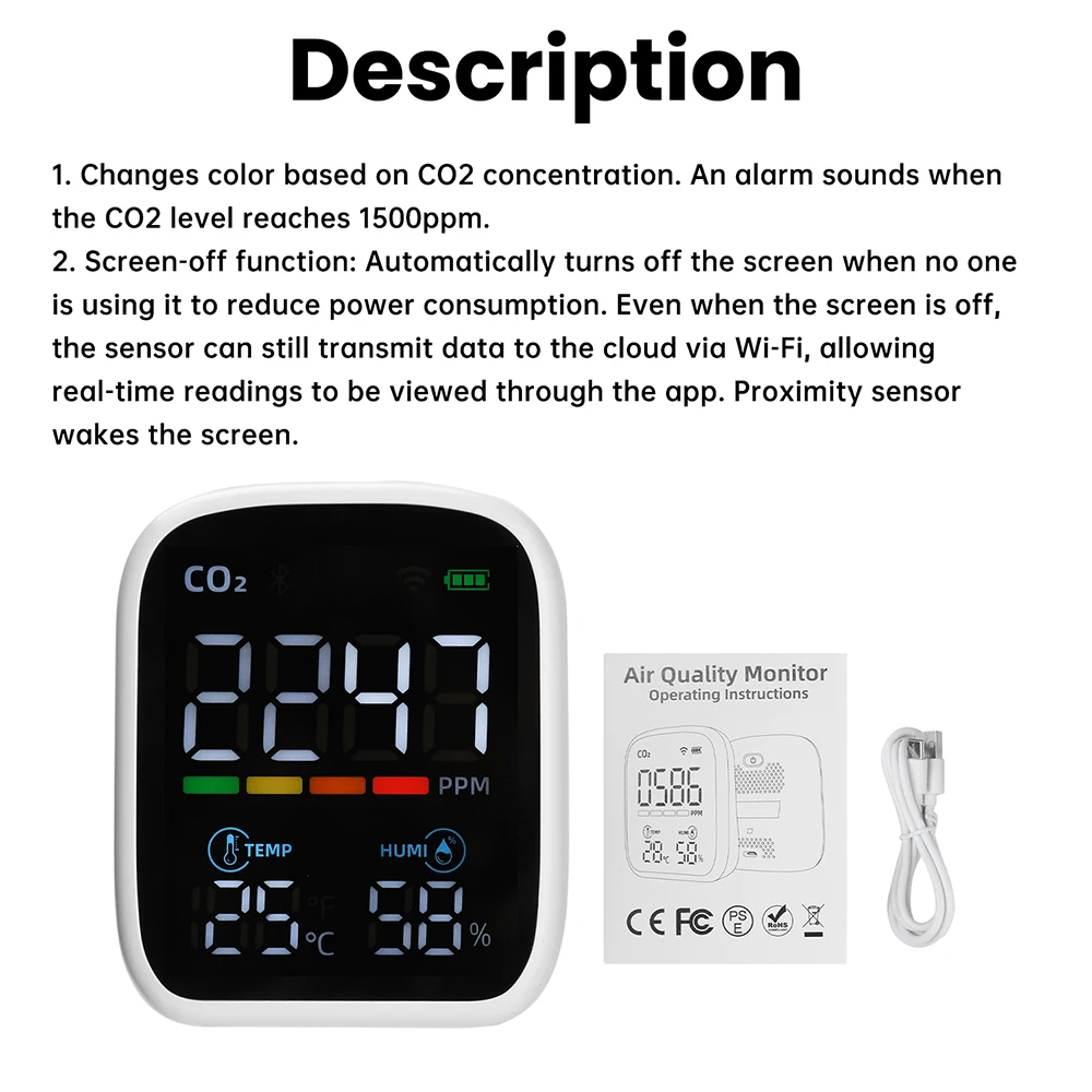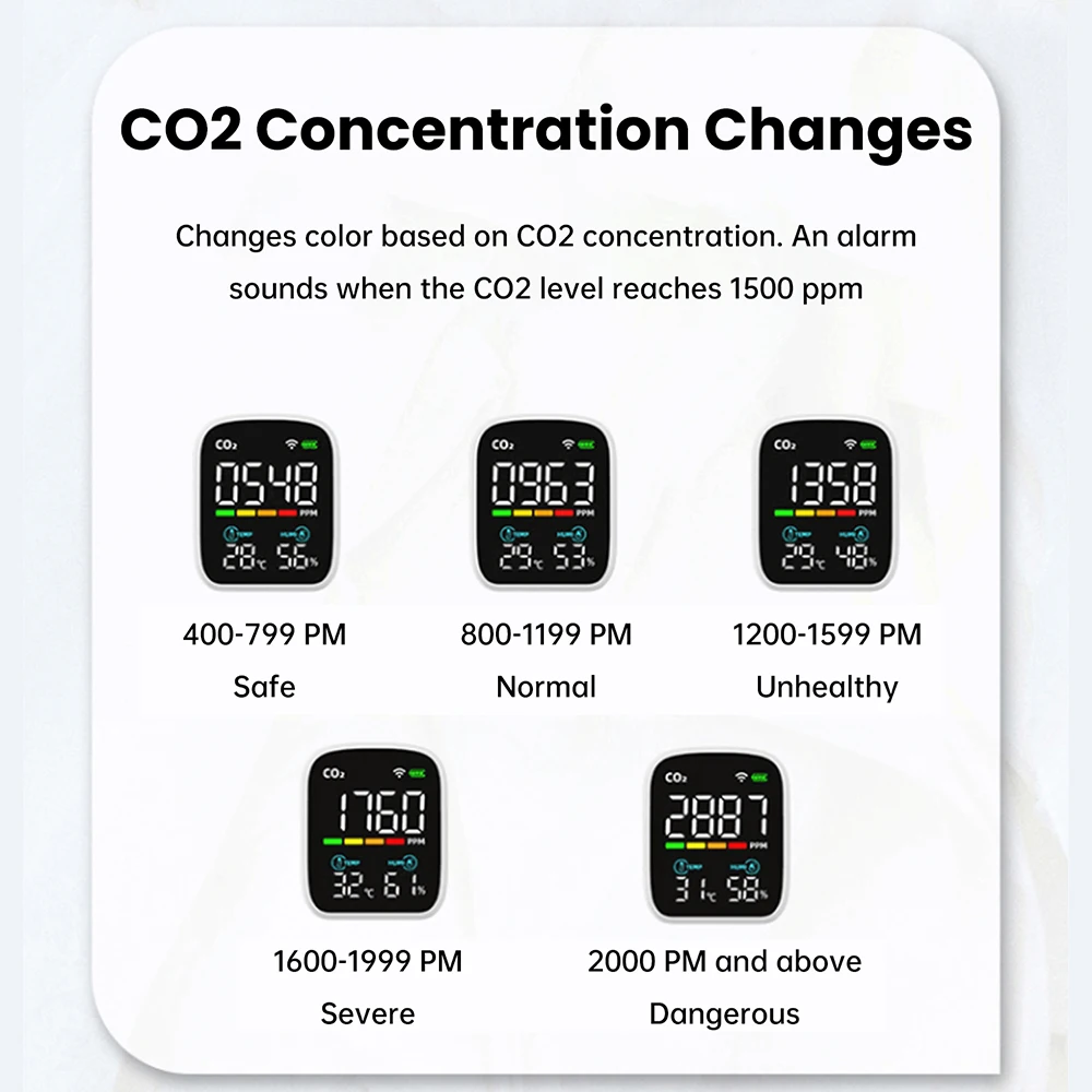 1. Changes color based on CO₂ concentration; triggers audible alarm when CO₂ reaches 1500 ppm