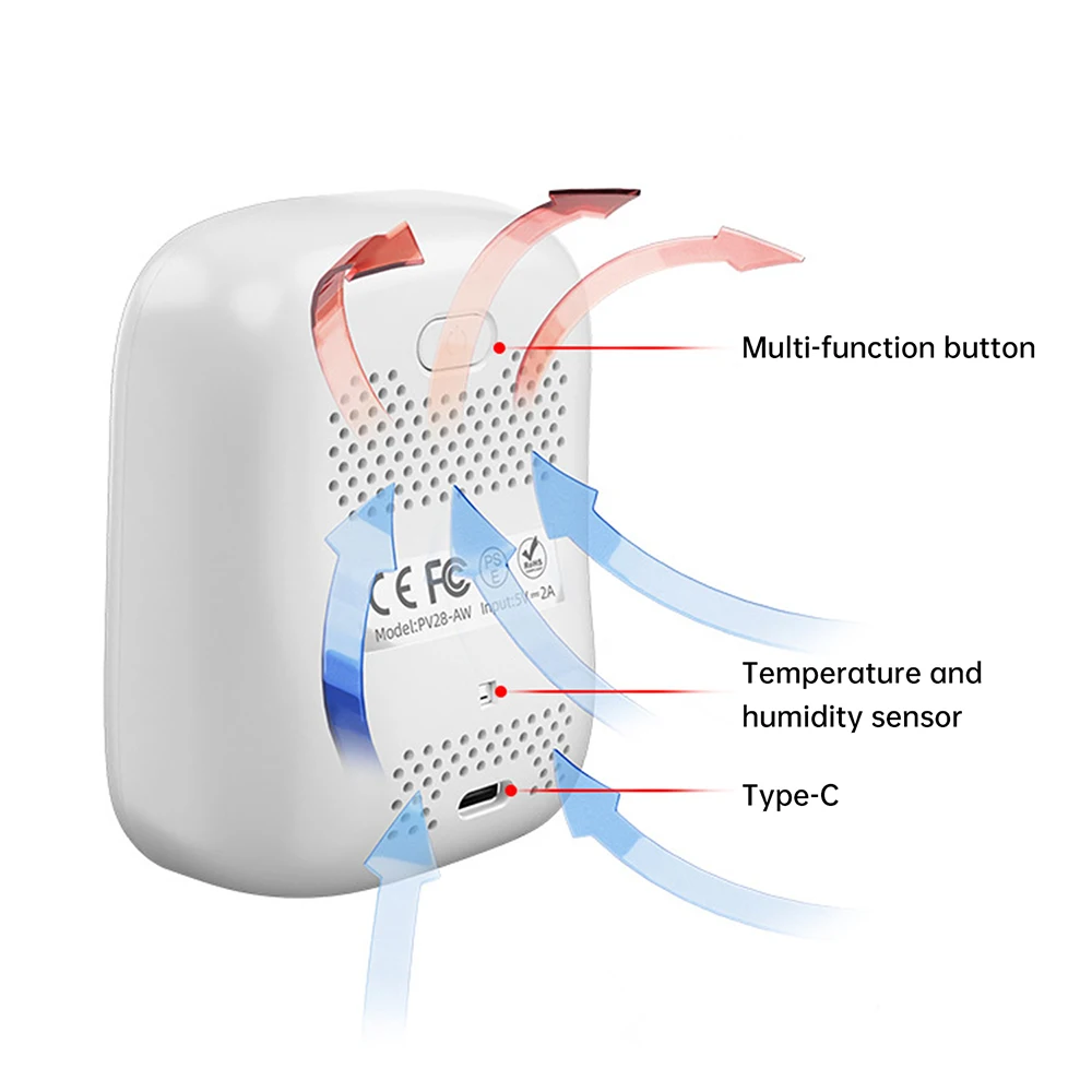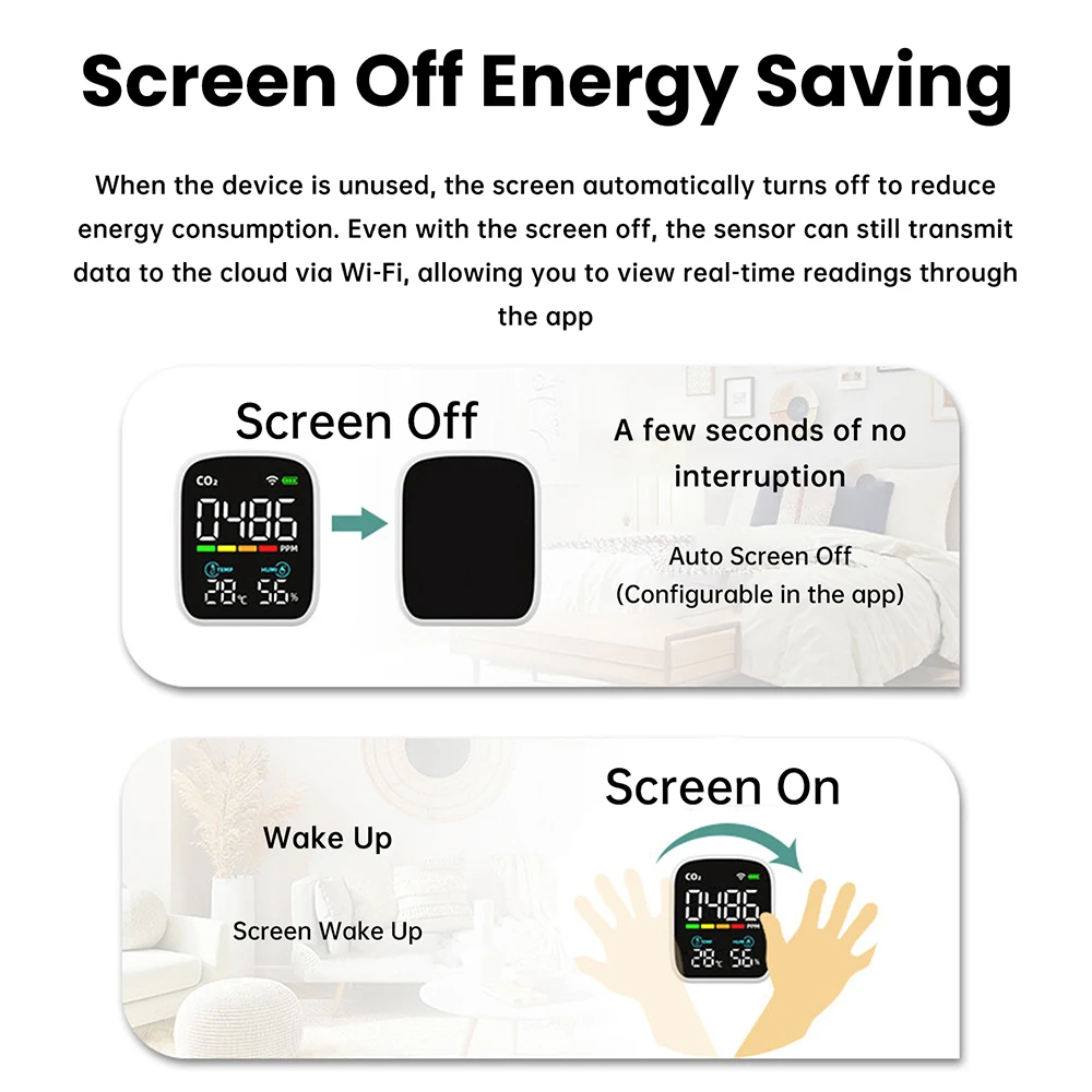 2. Screen-off function: Automatically turns off screen to reduce power consumption when unused. Sensor continues transmitting data to cloud via Wi-Fi for real-time viewing through app. Proximity sensor wakes screen