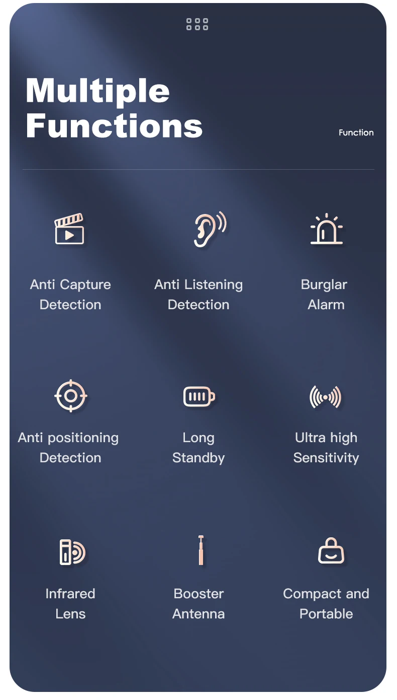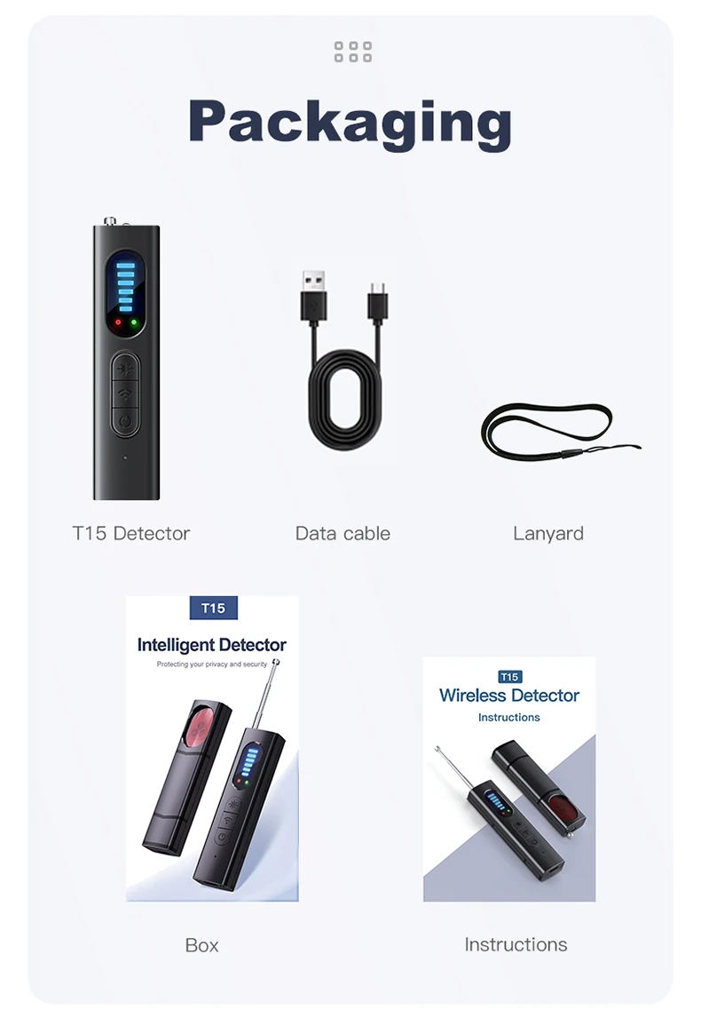 SPECIFICATIONSBrand Name: NoEnName_NullCertification: NoneChoice: yesHigh-concerned chemical: NoneModel Number: T15Origin: Mainland ChinaSmart home platform: None Hidden Camera Anti-Spy Detector Anti-monitoring Positioning Inte...