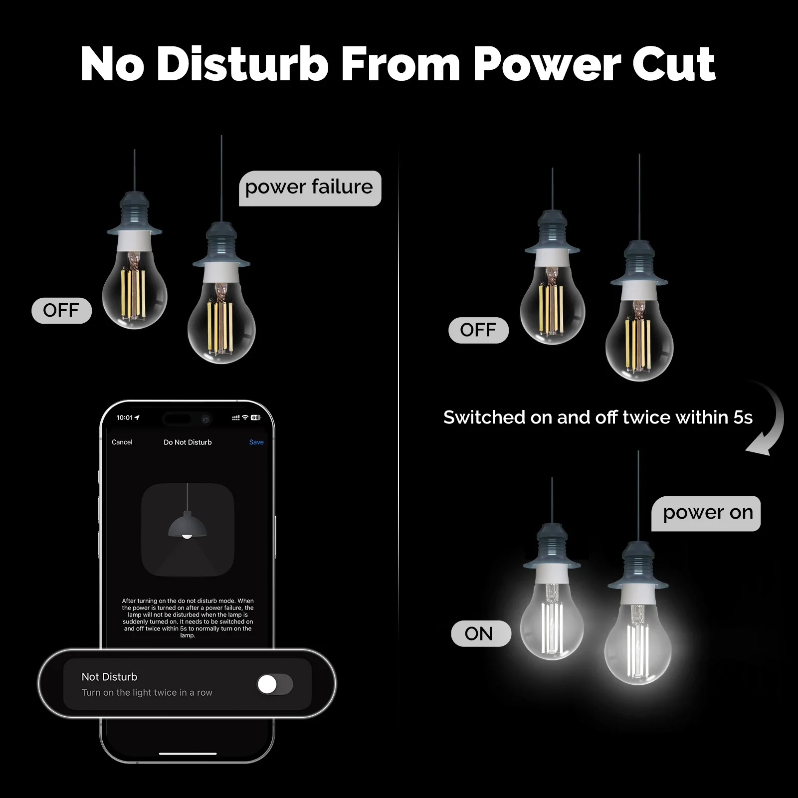 After a power outage is restored, the light bulb remains off, ensuring that your work and rest are not disrupted.