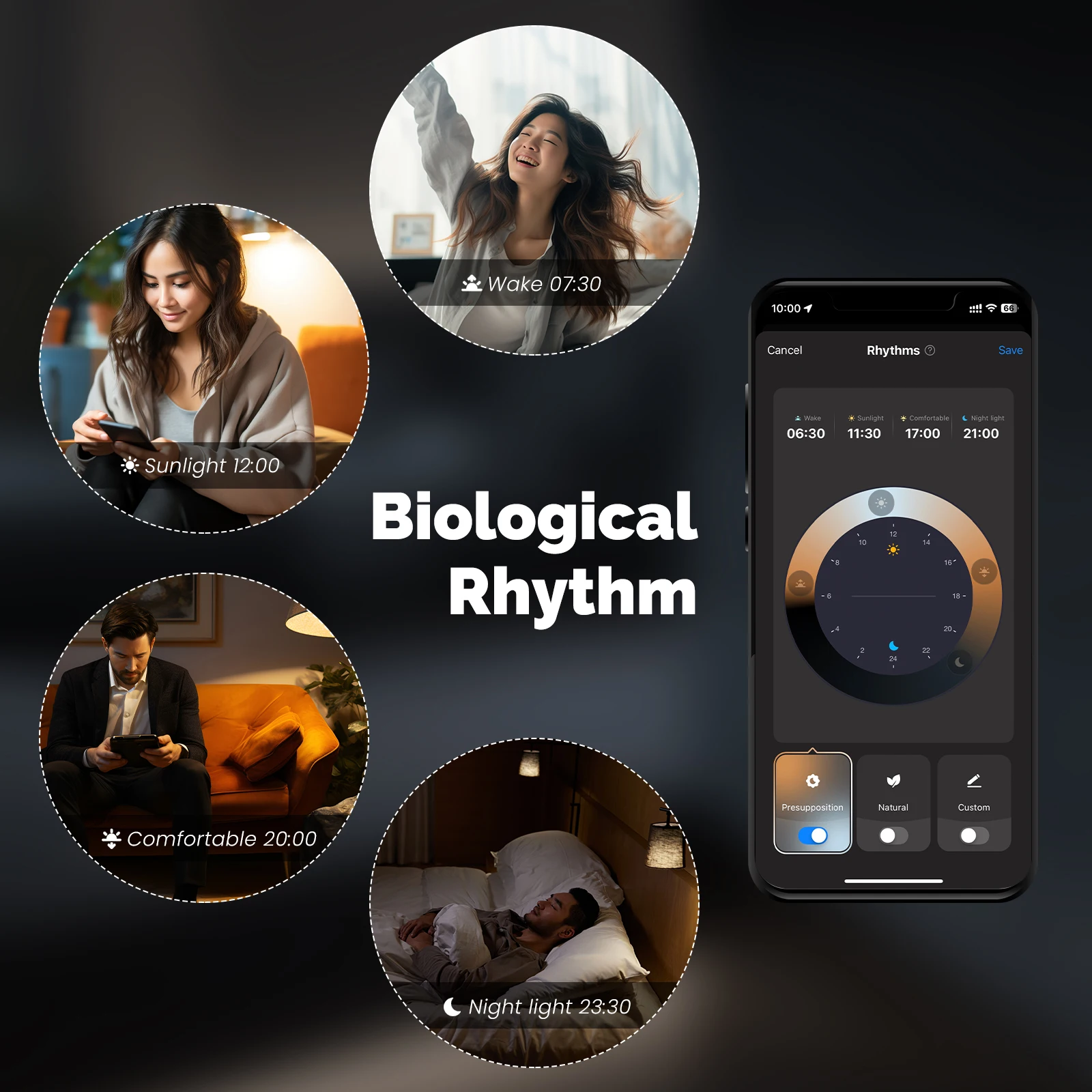 Design your own lighting by smart way with multiple scenes and you can choose from wide-range color temp, free adjustment of brightness and smart functions such as timer and biological rhythm.