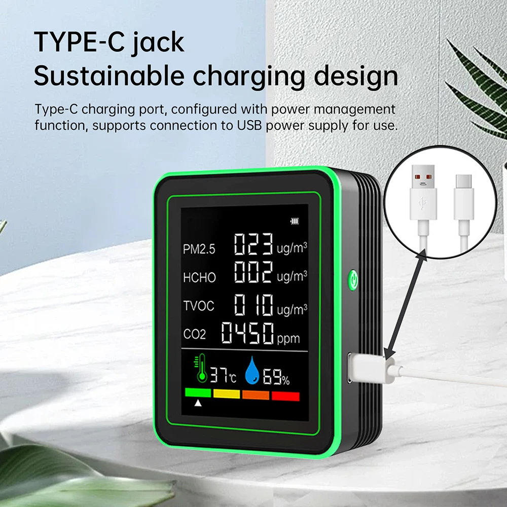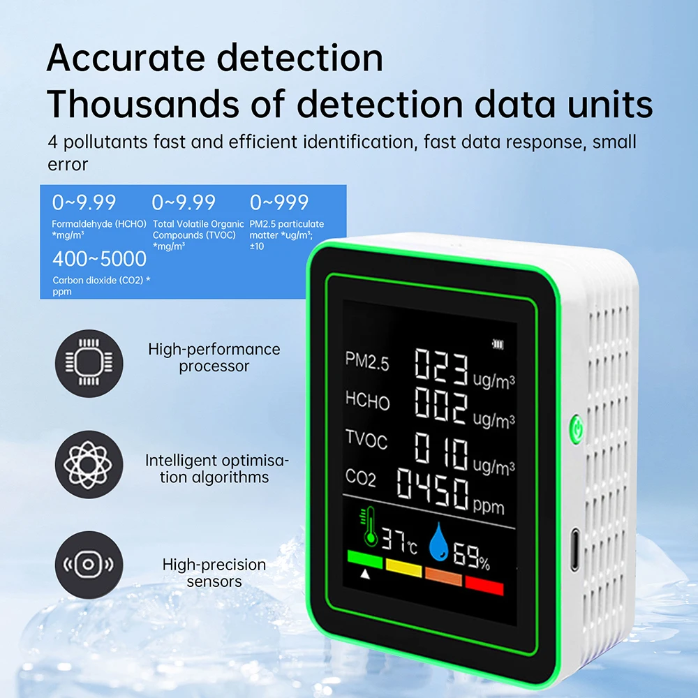 5.Item detection: Equipped with high-precision sensors, it can quickly and efficiently identify co2, formaldehyde, hcho, tvocd, and pm particles in the air. It also has temperature and humidity detection with comprehensive functions.