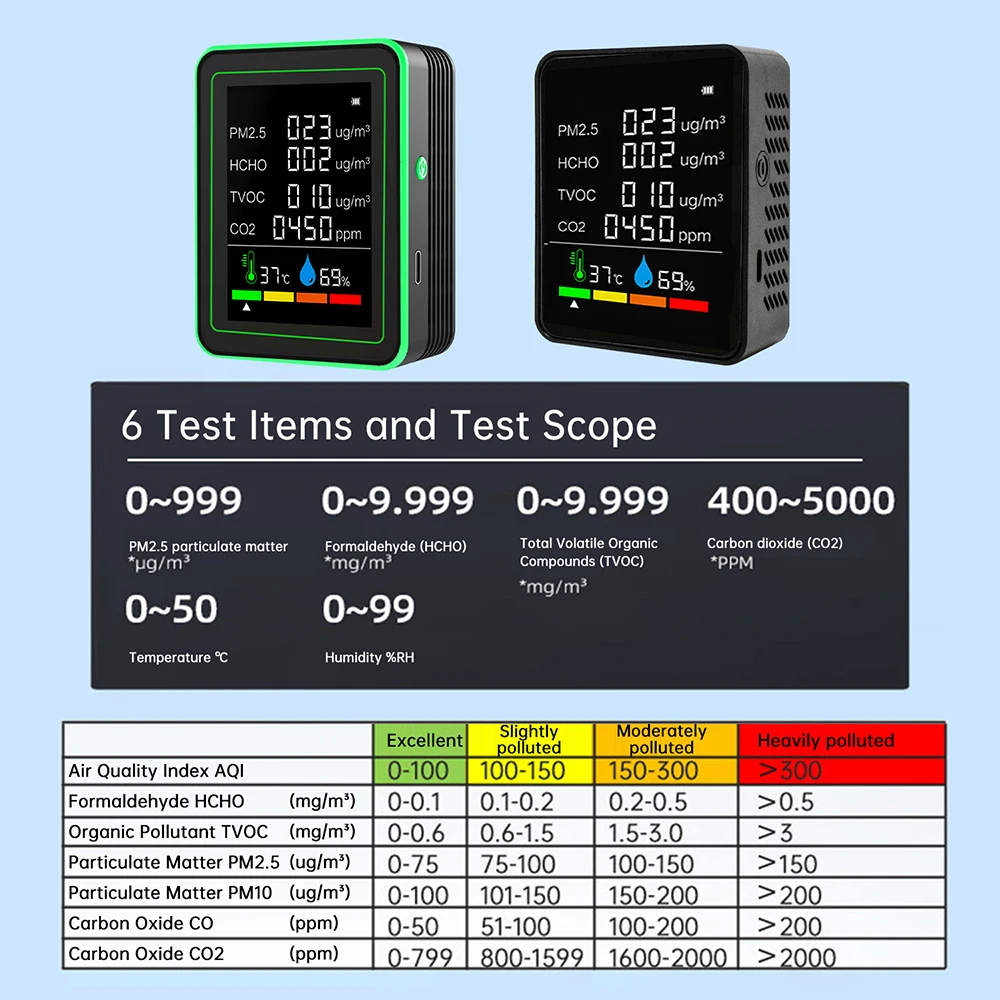 2.Four color alarm system: It displays air quality in green, yellow, orange, and red colors, and sounds an alert when the standard is exceeded.